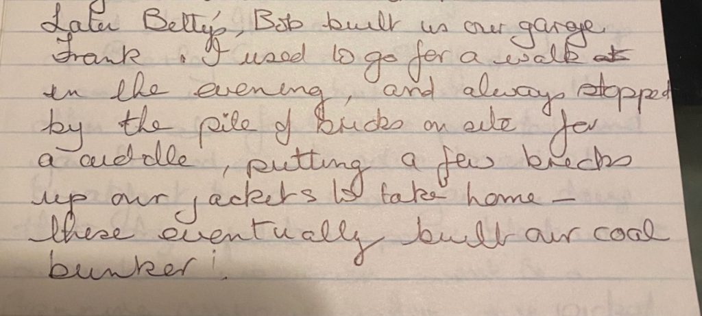 Bob had been a big help earlier at Tempest Avenue building a garage and, by more devious means, they managed to get the resources together to build a coal bunker, as Sheila explains below: